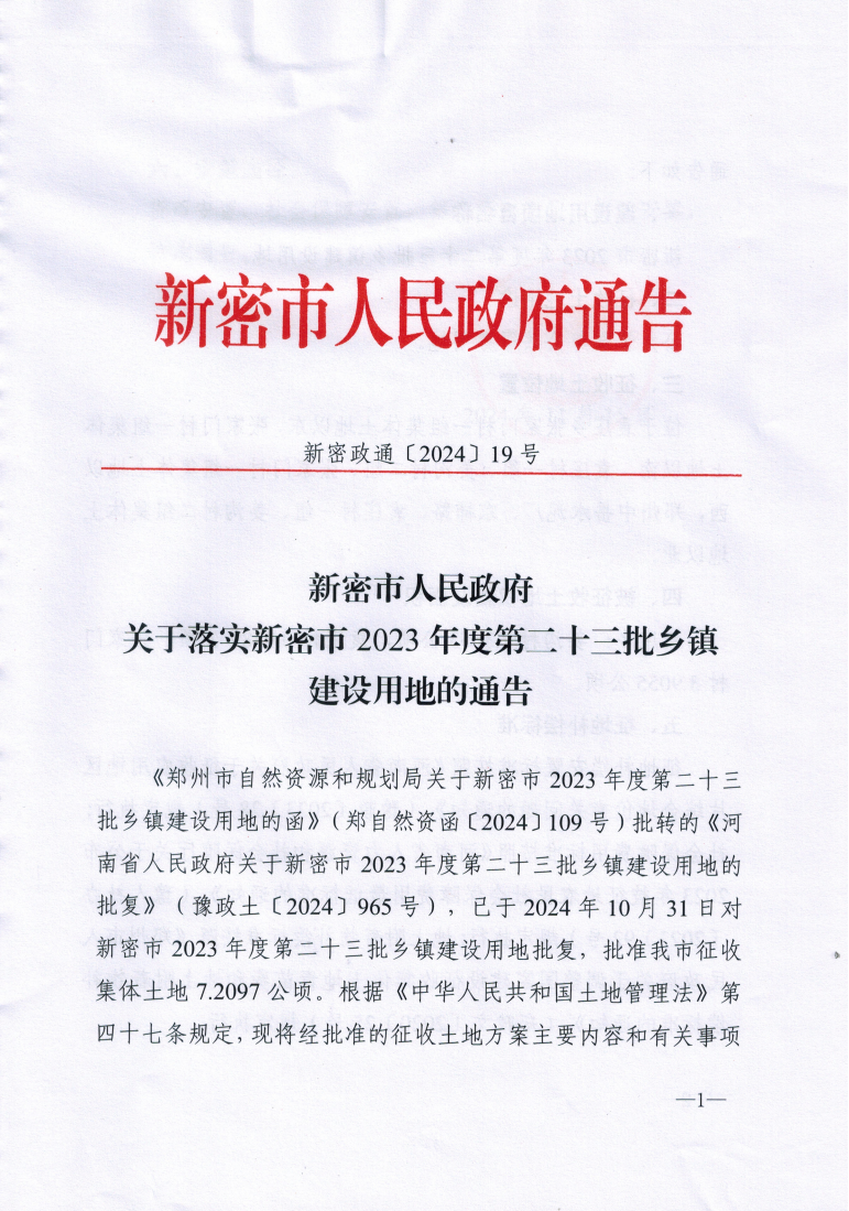 新密市人民政府关于落实新密市2023年度第二十三批乡镇建设用地的通告(新密政通〔2024〕19号)